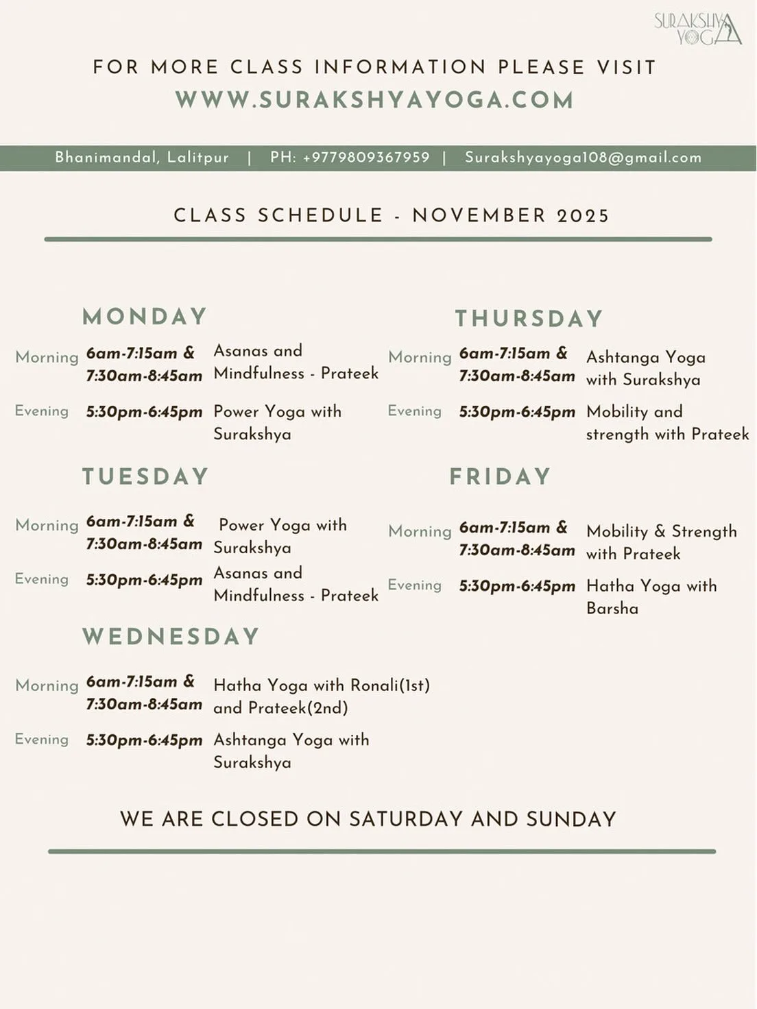 Surakhsya Yoga announces the yoga class Schedule for November. With specialised morning and evening classes.